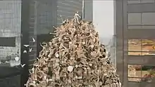 She continues singing the song while laying atop the pyramid of couples and changes her position as the song approaches its second verse. A convertible standing in the middle of a road is shown releasing a bunch of white balloons from its top. The scene switches back to Minogue, from where the camera pans upward to reveal a large white inflatable elephant floating in between two skyscrapers. The flash mob continues growing in size and the height of the pyramid increases. Minogue sways her hand above the participants of the mob, emphasising rings and jewellery designed by UK-based jeweller Shaun Leane.[71] During the bridge section of the song, Minogue is pulled inside the pyramid and the lighting is dimmed down. The song's breakdown coincides with scenes of a white horse galloping on a road amid various couples kissing each other. As the chorus begins, Minogue again rises up and stands atop the pyramid, which has greatly increased in height. Popjustice pointed out that the increment in the height of the pyramid is reflective of the lines of the song in which Minogue repeats the word "higher".[70] The camera switches to a distant view of the scene, showing the pyramid in between the skyscrapers and the floating elephant and balloons. The video ends with Minogue releasing a dove in the air.