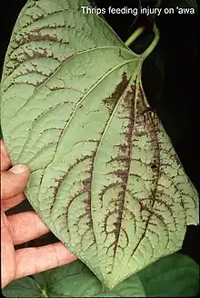 Thripinema fuscum is a Allantonematidae nematode that, can naturally decrease the population of Frankliniella fusca, Tobacco thrips.[5] Commonly found in Florida, T. fuscum that infect tobacco thrips have been shown to only affect the reproduction system of the thrips, causing a decrease in thrips over time.[5] Infertility of F. fusca is caused by damage to ovarioles and loss of eggs when infected by T. fuscum.[5] The life cycle of the T. fuscum from infection to the adult life stage is around 9 days in the F. fusca.[6] The infectious nematode lives primarily in the hemocoel of the thrips.[6]