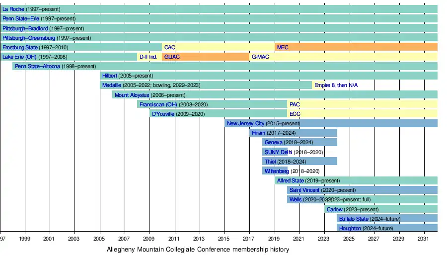 The most recent changes to conference membership took place in 2020, with two full members and one associate member leaving. D'Youville College began a transition to NCAA Division II in the East Coast Conference,[1] and Franciscan University of Steubenville completed a multi-year transition to full membership in the D-III Presidents' Athletic Conference.[2] Wittenberg University, which became a men's volleyball associate in 2018–19, left the AMCC to return to the Midwest Collegiate Volleyball League, where it had played from the start of its program in the 2015–16 school year through 2017–18.[3] Medaille College joined the entirely New York-based Empire 8, effective the 2022–23 school year.[4] Wells College, current affiliate member for swimming and diving, will add men's volleyball to compete in the AMCC as an affiliate, effective the 2023 spring season (2022–23 school year).[5] Carlow University is joining in 2023–24 from the National Association of Intercollegiate Athletics' River States Conference but is spending its exploratory year in the prior NAIA season.[6]