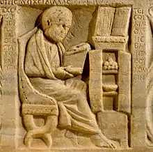 The earliest depiction of a Roman book cabinet or armarium, with scrolls inside on the upper shelf. From a sarcophagus dated to 200–300 CE, i.e, about the time Plotinus was in Rome. Though found in Ostia, a port near Rome, the Greek inscription suggests a Greek resident. The open case containing surgical tools on the cabinet top, the other scrolls, and a basin for bleeding patients within the cabinet suggest a learned physician (Metropolitan Museum of Art, N.Y., 48.76.1).