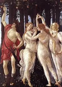 Botticelli's Primavera (detail, c. 1482). Florentine painters led the Renaissance shift from religious to pagan, allegorical themes. Lorenzo de' Medici was the patron of both Botticelli and Ficino, and extant letters suggest Ficino may have been consulted about the subjects of Botticelli's paintings.