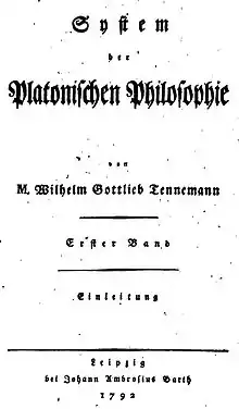 The philosopher Wilhelm Gottlieb Tennemann (1761 – 1819) influentially denied that Plato was a mystic (Schwärmer) and portrayed him as a precursor to Enlightenment rationalism and Kant's philosophy.[62] Echoing Luther's solo scriptura, Tennemann emphasized that Plato's dialogues were the 'only pure and clear source' for evidence about Plato's philosophy,[63] and thus rejected the ancient allegorical commentaries. Like the Neo-Platonists, however, Tennemann argued at length that Plato did have a 'secret' or 'esoteric philosophy.'[64] Drawing on the criticism of writing in Plato's Phaedrus and the Seventh Letter attributed to Plato, Tennemann asserted Plato had both practical and philosophical reasons for withholding his 'unwritten doctrines.'[65] Tennemann finally laid out his grand project of close reading and comparisons between the dialogues that, he claimed, had enabled him to reconstruct much of Plato's lost esoteric philosophy.[66] According to Tigerstedt,
