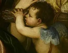 According to Ricketts, the Allegory in the Louvre was by 1910 in a "shocking state of partial damage by abrading and retouching, and by centuries of dirt".[13] The two ladies, as is often the case with popular pictures, have in his view been "terribly retouched", and some damage has happened to the exposed bosom of the woman who holds the crystal, some abrasure of the pigment, due possibly to the removal of an added drapery which at one time may have covered it.[9]