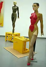Jones first group of erotic fibreglass sculptures, of a Hatstand, Table and Chair gained international attention when exhibited in 1970. The works were met with strong protests for perceived misogyny, which succeeded in making Jones a "cultural hot potato".[5] Laura Mulvey writing for Spare Rib magazine suggested the sculptures was inspired by latent castration anxiety. Almost a decade later, when they were put on display at the Institute of Contemporary Arts in 1978, they were attacked with stink bombs. Eight years later, on International Women's Day, Chair was damaged by paint stripper while exhibited at the Tate.[6] According to art historian and curator, Marco Livingstone, writing in 2004: "More than three decades later, these works still carry a powerful emotive charge, ensnaring every viewer's psychology and sexual outlook regardless of age, gender or experience."[14]