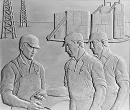 During the Great Depression, President Franklin Delano Roosevelt initiated the New Deal. One of its programs was the Treasury Department Section of Painting and Sculpture, under which the federal government commissioned artists to create art for a variety of public buildings, often post offices. Tennant created a frieze of three plaster reliefs — Cattle, Oil, Wheat (1940) — for the U.S. post office in Electra, Texas.[7][8]