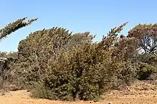 This sheoak was first formally described in 1943 by Charles Gardner who gave it the name Casuarina pinaster in the Journal of the Royal Society of Western Australia from specimens collected near Nyabing by William Blackall.[4][5] It was reclassified in 1982 as Allocasuarina pinaster by Lawrie Johnson in the Journal of the Adelaide Botanic Gardens.[6] The specific epithet (pinaster) means "imitation pine".[7] Specimens of compass bush consistently lean in a southerly direction at an angle of 30°- 40° from vertical.[3]
