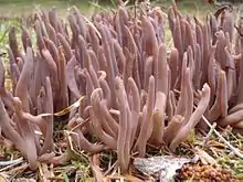 Alloclavaria is a clavarioid genus in the Hymenochaetales recently segregated from Clavaria by molecular analysis.[1] Phylogenetically related fungi are in the agaricoid genera Rickenella, Contumyces, Gyroflexus, Loreleia, Cantharellopsis and Blasiphalia, as well as the stipitate stereoid genera Cotylidia and Muscinupta.[2] The only species as yet placed in Alloclavaria is the type, formerly known as Clavaria purpurea under which name it is often cited or illustrated.. It is suspected, via circumstantial evidence, i.e. habitat, but not proven, that Alloclavaria is mycorrhizal.