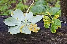 Allodus podophylli, the mayapple rust,[1] is a plant pathogen. This fungal parasite forms tiny bright orange cups on the underside of leaves of mayapple.[1]