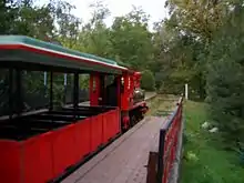 Central Park was privatized in 1999, and the track and one of the stations was subsequently restored. The railway currently operates as a private enterprise using a miniature Italian diesel locomotive built to look like a steam locomotive with three open carriages.[1] A fake tunnel that is too small for any of the traditional locomotives or carriages has been erected over the railway track. Prior to entering the tunnel, actors playing Native Americans sometimes pretend to attack the train. Inside the tunnel, the railway sometimes puts on a puppet show.[2] At the end of August 2001, the wooden Dostyk station building burned down.[1]