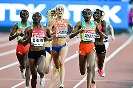 At the 2016 Summer Olympics held in August in Rio de Janeiro, Almaz set a world record of 29:17.45 in the 10,000 metres, topping Chinese athlete Wang Junxia's 23-year-old world record by 14 seconds.[16][17] No one previously had run within 22 seconds of Wang's record.[18] The 10,000 metres was already an extremely fast race when Ayana broke away with 12 laps to go. Second-placed Vivian Cheruiyot of Kenya finished just a second shy of Wang's record and double Olympic 10,000 metres champion Tirunesh Dibaba earned the bronze medal with a 12 seconds improvement on her personal best and the fourth fastest time in history. Multiple national records were set, and eighteen competitors set personal bests.[19] The lax drug testing regime in Ethiopia[20] and the doping scandals that embroiled athletics before the Rio Olympics caused some to question whether Almaz had been doping.[21] British commentators Brendan Foster and Paula Radcliffe, both former world record holders in distance events, were skeptical about Almaz's performance.[17] Fellow competitors reported that before the race, the Ethiopian was coughing and did not seem well.[22] In her post-race press conference, Ayana said her time was purely the outcome of hard training.[23]