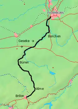 The northern section from Paderborn to Büren was opened on 20 October 1898 and the rest of the line between Büren and Brilon was completed on 1 April 1901.[2] The line was used by passengers and freight traffic, originally hauled by steam locomotives and later by diesel locomotives. Passenger services were eventually operated with diesel multiple units.
