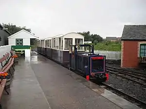 The Almond Valley Light Railway is a 2 ft 6 in (762 mm) narrow gauge heritage railway running at the Almond Valley Heritage Trust site at Livingston, Scotland.[1][2] The railway operates at weekends between Easter and the end of September and daily during some school holiday periods. There are two stations, both with waiting shelters and run round loops. A small two-road loco shed is provided at the heritage centre end of the line. There is a storage siding here also.