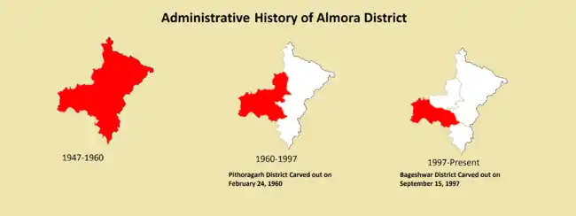In the 1960s Bageshwar district, Pithoragarh district and Champawat district had not yet been formed and were part of Almora district.[5] Pithoragarh district was carved out of Almora on 24 February 1960 and Bageshwar district on 15 September 1997. In 2011, Ranikhet District was proposed to be carved out of the Almora District and has yet to come into existence.