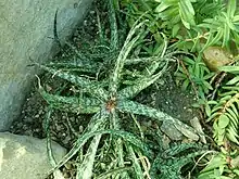 Aloe bakeri is a species of flowering plant in the family Asphodelaceae, native to Madagascar, where it grows on rocky hills at low elevations.[3] Growing to 10–20 cm (4–8 in) tall by 40 cm (16 in) wide, it is an evergreen perennial forming multiple rosettes of spidery succulent green or reddish-green toothed leaves, heavily mottled with white. The leaves are typically 10 cm (4 in) long[4] and bear straight or slightly curved white teeth that are 1 mm long and about 1-2 mm apart.[5] In summer it produces red or orange, green-tipped tubular flowers.[6] These flowers are attractive to birds, bees, and wasps,[7] and are typically 2 cm (0.75 in) long, borne on racemes 30 cm (12 in) tall.[4]