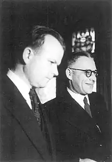 Despite being a member of the coalition, Vogt retained contacts within Nazi Germany throughout the 1930s and throughout, particularly with the Volksdeutsche Mittelstelle, who regarded him as a trusted contact.[1] Hoop rejected the fascist tendencies of the Liechtenstein Homeland Service.[10] He was an outspoken supporter of National Socialism throughout his premiership as Deputy Prime Minister and used his position to push relevant demands through Hoop, assisted by the party's president Otto Schaedler who agitated for a more cooperative stance towards Nazi Germany.[1][11] He met with Sicherheitsdienst Eugen Steimle in summer 1943 in Berlin.[12]