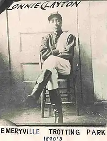 An African American, Lonnie Clayton was most likely born in Mississippi, on January 4, 1876, which is the date of birth and place of birth that are given on his death certificate.[1] He was one of the nine children of Robert and Evaline Clayton. At age ten, his family moved to North Little Rock, Arkansas, where he attended school and worked as a gofer for a hotel and as a shoeshine boy to help support his family. According to the Central Arkansas Library System's Encyclopedia of Arkansas History & Culture, a correspondent for the Thoroughbred Record wrote in 1896 that Clayton attended school and was considered "exceptionally bright."