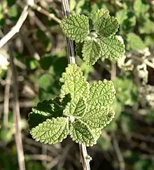 These plants are subshrubs, shrubs, or trees growing 0.5 meters to 15 meters tall.[3] Many are very aromatic.[4] The stems may be four-angled and smooth when new, becoming more angular or rounded and often furrowed or striated with age. The leaves are evergreen or deciduous in the dry season. They are often oppositely arranged or whorled, but can be alternate or clustered. The blades are variable in shape, toothed or smooth-edged, and hairless to rough-haired on the upper surfaces. The undersides may have glandular hairs. The inflorescence is usually a raceme of widely spaced clusters of 3 to 6 flowers each. There are leaflike bracts under the flowers which can be showy in some species. The calyx of sepals has 2 or 4 lobes and is persistent, enclosing the fruit as it develops. The flower corolla is tubular with a wider mouth divided into four lobes, one of which may be cleft. The corolla can be white, purplish, blue, or pink. The narrow style is tipped with a bilobed stigma and there are 4 stamens. The fruit is a schizocarp.[3]