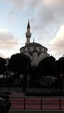 It is found in the district of Alsancak on the intersection of Şair Eşref Bulvarı and Ali Çetinkaya Bulvarı.[2] The classical Ottoman styled Mosque was built between 1948 and 1950 by efforts of the Hocazade Ahmet Ragıp Üzümcü Foundation. The building is mostly white, but the main and cascading domes are blue as are the double balconies of the minarets. The İzmir Municipality and the High Council for Historic Monuments carried out a restoration in 2002[3]
