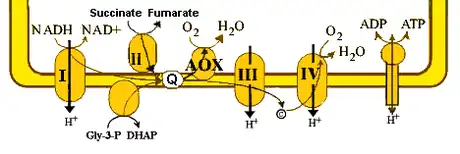 This metabolic pathway leading to the alternative oxidase diverges from the cytochrome-linked electron transport chain at the ubiquinone pool.[6] Alternative pathway respiration only produces proton translocation at Complex 1 (NADH dehydrogenase) and so has a lower ATP yield than the full pathway. The expression of the alternative oxidase gene AOX is influenced by stresses such as cold, reactive oxygen species and infection by pathogens, as well as other factors that reduce electron flow through the cytochrome pathway of respiration.[7][8] Although the benefit conferred by this activity remains uncertain, it may enhance an organism's ability to resist these stresses by maintaining the oxidized state of the upstream electron-transport components, thereby reducing the level of oxidative stress induced by overreduced electron carriers.[9]