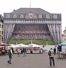 The building was erected to replace the former town hall, which had been destroyed by artillery fire during the Siege of Bonn (1689) and subsequently only makeshiftly restored, a three-storey building presumably erected in the 15th century. After a design by the master builder Nikolaus Krakamp for a new town hall had been rejected,[2] court architect Leveilly came into play, whose design was available in autumn 1736[3] After his approval, Elector Clemens August of Bavaria laid the foundation stone for the new building on 24 April 1737, which was topping out on 5 November 1737 and could be occupied the following October; the first joint meeting of the Stadtmagistrat, mayor, lawyers and council took place here on 29 October 1738.[3] The railing of the outside staircase was not made until 1765 and finally around 1780, the plastering and the facade decoration of the town hall was completed.[2][3] Also in 1780, the municipal meat hall, a three-aisled building with square pillars, was built as an extension to the town hall on its former rear side facing Rathausgasse according to plans by the court architect Johann Heinrich Roth.[4] In the 1870s, this building, eventually used by the city treasury and the city archives, was rebuilt in simple forms.[2][5][4]