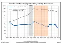 Development of population since 1875 within the current boundaries (Blue line: Population; Dotted line: Comparison to population development of Brandenburg state; Grey background: Time of Nazi rule; Red background: Time of communist rule)