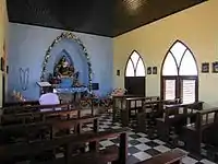 The original church was constructed in 1750 by Caquetio Indians and Spanish though the island did not have a priest yet. The pioneering work of establishing the church and converting local Indians into the Catholic Christian faith was the sole work of Domingo Antonio Silvestre of Venezuela, which he achieved with his own funds. It is said to be the first church to be established in Aruba. This first church was built with stone walls and a straw roof. It was dedicated to Mother St. Mary, the “Mother of the Rosary” and hence considered exceptional in Aruba. A one-foot cross, which was brought from Venezuela by one of the priests, was installed here. Subsequent to Domingo Antonio Silvestre's death Miguel Enrique Albarez (a son of the second fiscal) took control of the church, and then by Domingo Bernardino Silvestre son of the pioneer priest of the church. When the tragic plague stuck the place, many of the inhabitants of Alto Vista died and the remaining residents vacated the place and moved to Noord where the second church of Aruba was built. The Alto Vista Church was deserted from 1816 and went into ruins and the old wooden cross went under possession of many priests. This cross which was at the original altar is now seen in the St. Ann's church in Noord. However, Francisca, a school teacher in Aruba, with single-minded dedication proceeded to revive the historic church of Aruba by locating it amidst the ruins after she came across by chance a picture of St. Mary's with flowers. She collected funds of about 5000 Florins from local Arubans, got a statue of St. Mary's made in Netherlands and brought it to Alto Vista and installed it at the new church built at the site of the old chapel, between March and May 1952, after obtaining permission from the Bishop in Curaçau. The statue was adorned with a golden crown studded with gem stones in 1954 with donations contributed by several Arubians. Unfortunately this statue was vandalized by a maniac. The statue has since been replaced by a new one. With this chapel, Catholic religion made inroads into Aruba.[2][3][4][8]