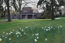 Since 2008[6][7] there has been in the north-east of the cemetery a special burial ground for supporters of the Hamburger SV (HSV): the Volksparkstadion lies directly over the road. For its construction inspiration was taken from the shape of a football stadium, with allusions to elements such as the stands, the goal and the field. Parts of the area have been laid with turf from the stadium ground itself.[8]