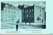 Classes were temporarily held in Oberlaak starting in March 1846 while the 16th century school was rebuilt and modernized. The renovated school at Altstädtischer Kirchplatz was rededicated on 12 April 1847.[5] The three-storied building contained eight classrooms, a library, a laboratory, an auditorium, a conference room, and the director's residence. Altstadt Gymnasium moved again in Easter 1889 to a new structure in place of the dismantled Pulverturm on Altstädtische Langgasse. It was designed by the Stadtbaurat Julius Krüger and cost 335,257 Mark.[6] The walls of its hall were decorated with images of the Ancient Olympic Games by the painters Ernst Bischoff-Kulm and Emil Dörstling.[7] The sons of Königsberg's higher educated Jews, such as lawyers, doctors, and journalists, often attended Altstadt Gymnasium, while the sons of Jewish merchants were more likely to attend Kneiphof Gymnasium.[7]