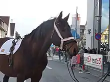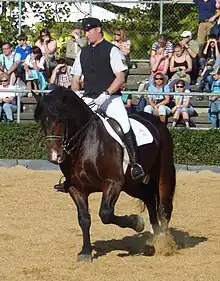 It is a cob-type[1][3][7] horse, belonging to the "heavy warmblood" category of older half-blood breeds, of which lighter, more recent models exist.[4] Medium-sized,[6] according to the German breed association[7] and the Delachaux guide,[1] their height ranges from 1.55 m to 1.65 m. The average height recorded for females in the DAD-IS database is 1.60 m.[12] Stallions must measure less than 1.70 m. Bonnie Lou Hendricks' encyclopedia (University of Oklahoma, 2007) gives an average of 1.65 m.[3]