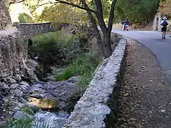 The valley has abundant mineral springs, which were touted as beneficial to people's health. In the late 19th century and through the 1930s, the park was famed throughout the country as a health resort advertising hot and cold sulfur, soda and magnesia springs, as well as mixtures of sulfur, soda, magnesia, arsenic, iron, and their sulfates. Plumbing routed some of these springs into bathtubs or drinking fountains. A very early 20th century advertising brochure listing the names of eleven physicians suggested: "...a remarkable spring furnishing a mixture of sulphur, magnesia, and arsenic, which has been found very beneficial in cases of rheumatism, Bright's disease, and other kidney and stomach troubles and malarial affections." Through those years and as late as the 1970s, the park featured a natatorium (a huge, indoor swimming pool filled with heated sulfur water), dozens of private heated mineral baths that visitors could rent, a restaurant, and various other buildings.[3] Many of the springs were enclosed in stonework grottos, and stone bridges were built across the creek. Due to overuse, some of the springs became extinct, and surviving ones became very weak, producing very little output.