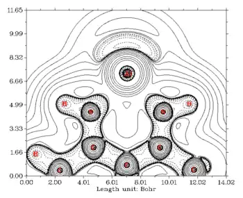 Initial electronic structure calculations of aluminium(I) nucleophiles were gained using ab initio calculations. Cimpoesu and coworkers analyzed the first monomeric aluminium(I) compound by plotting the contour map of the Laplacian of the electron density inside the molecule and found that there is indeed a lone pair localized on the aluminium atom, in a spherical geometry, pointing outside of the ring.[15] Their computational analysis confirmed that the aluminium lone pair is localized in an s orbital, in good agreement with the aluminium(I) atom having an s2 electron configuration.