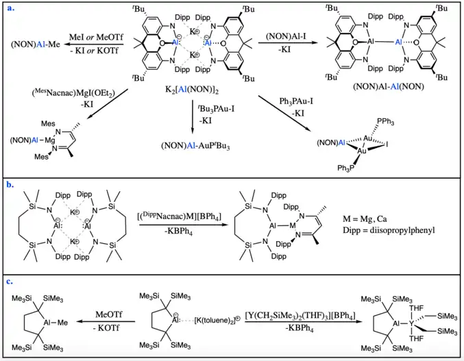 While all aluminyl anions display nucleophilic character, a few of them have been shown to participate in nucleophilic substitution reactions with carbon-based or metal-based electrophiles. Aldridge and Goicoechea's diamido aluminyl anion, K2[Al(NON)]2, can react with methyl electrophiles such as methyl iodide and methyl triflate to yield the corresponding methyl-aluminium product. The same aluminyl system can react with bulky metal iodide electrophiles in nucleophilic substitution reactions to form new aluminium-metal bonds, including aluminium-aluminium, aluminium-magnesium, or aluminium-gold bonds.[5][16]