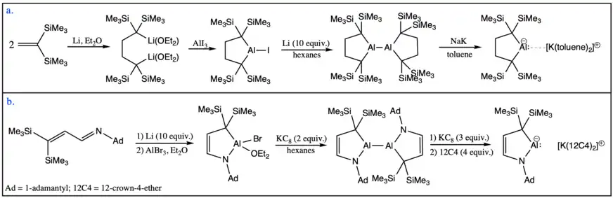 - ↑ Cui, Chunming; Roesky, Herbert W.; Schmidt, Hans-Georg; Noltemeyer, Mathias; Hao, Haijun; Cimpoesu, Fanica (2000). "Synthesis and Structure of a Monomeric Aluminum(I) Compound [HC(CMeNAr)2Al] (Ar=2,6–iPr2C6H3): A Stable Aluminum Analogue of a Carbene". Angewandte Chemie International Edition. 39 (23): 4274–4276. doi:10.1002/1521-3773(20001201)39:23<4274::AID-ANIE4274>3.0.CO;2-K. ISSN 1521-3773. PMID 29711904.