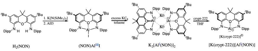 The most common ligands employed so far in the synthesis of nucleophilic aluminyl anions are diamido dianions. The first aluminyl anion to be isolated by Aldridge, Goicoechea and coworkers is supported by a xanthene-based diamido ligand, referred to as NON by the authors. In its synthesis, the xanthene-dianiline H2NON was first deprotonated in the presence of a strong base. Metallation of the NON ligand proceeded via aluminium triodide addition, forming an aluminium(III) metal center. The aluminium(III) center was then reduced via addition of an excess of a strong reducing agent, potassium graphite (KC8), to the aluminyl species. Following the two electron reduction, a bright-yellow dimeric species with the chemical formula K2[Al(NON)]2 was formed, as confirmed by X-ray crystallography.[5] The compound was found to be stable for several days at room temperature, both in the solid state and in a benzene solution. Each aluminium(I) atom is supported by two amido nitrogen atoms and one ethereal oxygen atom of the ligand, formally having a filled octet. The two monomeric units are joined by electrostatic interactions between the positively charged potassium cations and the electron clouds of the Dipp (diisopropylphenyl) substituents. The crystal structure confirms no aluminium-aluminium interactions, while the dimeric structure is preserved in solution, as highlighted by diffusion ordered spectroscopy (DOSY) NMR experiments.[5] However, in the presence of chelating agent [2.2.2]-cryptand (crypt-222), the potassium cation could be encapsulated, leading to a charge-separated complex with a "naked" aluminyl anion, the first such anion to be reported.[10] Following this initial synthesis, other nucleophilic diamido aluminyl anions have been reported, also synthesized through the reduction of the corresponding aluminium(III) iodide with excess potassium graphite and also isolated as a dimeric species with a similar structure to that of K2[Al(NON)]2.[11][12]