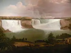 Fisher traveled throughout the northeastern United States searching out sites of landscape beauty such as the views of Springfield, Hartford, and Providence and the spectacular scenery of the White Mountains of New Hampshire. He sketched outdoors and began to compose pastoral scenes in his studio before Thomas Cole, Thomas Doughty, Asher B. Durand, or others of the Hudson River School gave serious attention to nature. The Watering Place, 1816, now in the collection of Fruitlands Museum, Harvard, Massachusetts, is his earliest extant pure landscape. His paintings of Niagara Falls, commissioned by Judge Daniel Appleton White of Salem, Massachusetts, were completed following his visit there in 1820.[1] His interest in depicting topographical subjects was activated when he obtained a commission to paint views of Harvard College. These paintings were executed expressly for the purpose of issuing engravings for wide distribution to the public. The images of Harvard Yard were later reproduced on Stafforshire transfer-printed earthenware produced by several English companies for the American market. He was commissioned by Charles Henry Hall, owner of the Harlem Stud Farm in New York, to paint portraits of the famous American race horses of the period. He completed at least six portraits of the renowned American Eclipse between 1822 and 1823. Lithograph prints made from these paintings were used in The American Turf Register, the first magazine attempting to improve the breeding of thoroughbred horses in America.