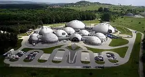 The 13,000 square metres (140,000 sq ft) domed complex features multiple sound stages, the world's biggest spherical shadeless blue screen, music scoring studios, a motion capture system, 16 mm and 35 mm laboratories, a color correction studio, a visual effects department, and a final mix studio.[1] Alvernia Studios activities included the production of feature films and commercials, as well as the implementation of music projects (including the smallest concert of the world), video games,[2] shows and concerts.[3]
