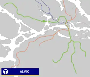Alvik metro station is a station on the Green line of the Stockholm metro, and on the Tvärbanan and Nockebybanan lines of Stockholm tramways. It is located on the border between the districts of Traneberg and Alvik, which are part of the borough of Bromma in the west of the city of Stockholm. The station is one of the intermediate termini along the northern section of the Green line, with line 18 trains normally terminating, and is also the terminus of the Nockebybanan.[2][3]