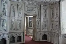 In the south of the hall, the door leads to the electoral Rest Room and the Blue Cabinet, with access to the privy chamber. The Rest Room was the bedroom of the Electress, and the pavilion also accommodates an armoury and a kennel room for the hunting dogs in the Blue Cabinet.[1]