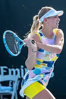 Anisimova played one tune-up event before the Australian Open, reaching the quarterfinals at the Auckland Open.[38] Despite having never won a singles match at a major, Anisimova made it to the fourth round of the Australian Open. She won her first three matches in straight sets, including a victory over one of the favorites for the title in world No. 11, Aryna Sabalenka, losing to eventual finalist Petra Kvitová.[39][40][41] The following two months, she did not record more than a single match win at any of her next four tournaments.[42]
