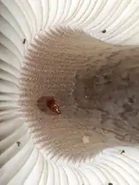 The stem is 4–14 cm (1+585+12 in) high, 5–25 mm (14–1 in) thick, and tapers slightly at the top. It is hollow and has a bulbous base measuring 10–30 mm (381+18 in) in diameter. The stem surface above the level of the ring is white, sparsely covered with woolly or fuzzy tufts, occasionally breaking into transverse bands; below the ring the stem surface is smooth or occasionally breaks into bands or fibrillose scales. It is whitish, buff or greyish-sepia streaked with grey. The stem base may or may not have a band or rim of buff to greyish-sepia volval remnants. The ring is membranous, grooved, whitish, buff, and greyish-sepia or lavender-grey. It first hangs freely before later sticking to the stem, often tearing and adhering to the edge of the cap. The flesh of the cap is white or stained mouse-grey under the central part, occasionally with a grey line above the gills; the stem flesh is white to pale buff.[4]
