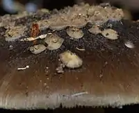 The cap of A. nothofagi is initially convex, later becoming flattened with a central depression, with radial grooves on the margin, reaching diameters of 3–13 centimetres (1–5 inches). The colour is variable, ranging from buff to dark grey to greyish-sepia, with radial streaks of dusky brownish grey. The cap surface is sticky when young or wet, but dries out with age. The remnants of the volva form small to large, irregularly shaped, felted patches, that are dull greyish-sepia to sepia, and sometimes scab-like. The gills are crowded closely together, and free from attachment to the stem. They are white to cream-coloured, 6–10 mm (1438 in) wide. The lamellulae (short gills that do not extend fully from the cap edge to the stem) have somewhat truncated ends.[4]
