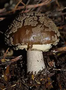 Amanita nothofagi is a species of fungus in the family Amanitaceae. Endemic to New Zealand, the species was first described by mycologist Greta Stevenson in 1962. The fruit bodies have dark brown caps that are up to 13 cm (5.1 in) in diameter and covered with patches of soft greyish-brown scales or warts. The gills underneath the cap are crowded together, free from attachment to the stem, and white, becoming tinged with yellow in age. The stem of the mushroom is 4–14 cm (1.6–5.5 in) long by 0.5–2.5 cm (0.2–1.0 in) thick, and has a ring. The spore print is white, and individual spores are spherical to ellipsoid, measuring 7.5–9 by 7.5–9 micrometres. The mushroom may be confused with another New Zealand species, A. australis, but can be distinguished by certain characteristics. Amanita nothofagi is a mycorrhizal species, and grows in association with native New Zealand trees such as Southern Beech.