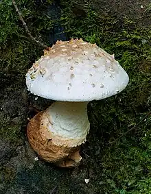 The fruit body has a pale brown cap that is initially convex before flattening with maturity to almost flat or even depressed in the centre. It is covered in prominent small warts which are roughly cone-shaped. The gills are pale orange-yellow. The brownish-white stalk is up to 10 centimetres (4 inches) high and 2.6 cm (1 in) wide with a prominent bulb up to 4.5 cm (2 in) in diameter. The ring is off-white and prominent but may fall off older mushrooms. The globular spores are amyloid and measure 7–10 by 5–8 μm.[2]