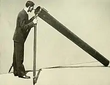 The first reflecting telescope Holcomb made to order was for John A. Fulton of Chillicothe, Ohio, in about 1826. It was fourteen feet (4.3 m) long with a ten-inch (254 mm) aperture and six eye pieces and a magnification from 90 to 960 times. He fabricated and manufactured telescopes in earnest soon after, probably around 1826.[6]