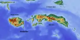 Ambelau or Ambalau is a volcanic island in the Banda Sea within Maluku Islands of Indonesia. The island forms an administrative district (Indonesian: Kecamatan Ambalau) which is part of the South Buru Regency (Indonesian: Kabupaten Buru Selatan) of Maluku province (Indonesian: Provinsi Maluku), Indonesia. It has a land area of 201.7 km2, and had a population of 6,846 at the 2010 Census;[1] the official estimate as at mid 2022 was 9,170.[2] The administrative center is Wailua, a settlement located at the south of the island. About half of the island's population is composed of indigenous Ambelau people who speak the Ambelau language; the other half are mostly immigrants from the nearby Maluku Islands and Java.