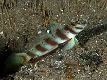 Amblyeleotris is a genus of fish in the family Gobiidae found throughout the Indo-Pacific region. This is the largest genus of the shrimp gobies or prawn gobies, so-called because of their symbiotic relationship with certain alpheid shrimps. The shrimp excavates and maintains a burrow used by both animals while the goby, which has far superior eyesight, acts as a lookout for predators. The shrimp maintains almost constant contact with the fish with an antenna. Fossil Amblyeleotris otoliths have been found together with alpheid shrimp remnants from as early as late early Miocene (Burdigalian) suggesting a possible mutualistic association since then.[1]