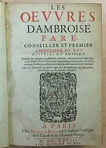 - ↑ Paré, Ambroise (1691). The works of Ambrose Parey, chyrurgeon to Henry II. Francis II. Charles IX. and Henry III. Kings of France. : Wherein are contained an introduction to chirurgery in general : a discourse of animals, and of the excellency of man. The anatomy of man's body. A treatise of praeternatural tumors ... Illustrated with variety of figures, and the cuts of the most useful instruments in chirurgery. Recommended by the University of Paris to all students in physick and chirurgery, particularly such as practised in camps and the sea. Wellcome Library. London : Printed: and sold by Jos. Hindmarsh, at the Golden Ball over against the Royal Exchange in Cornhil.