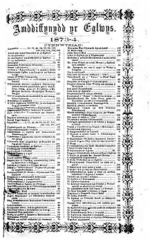 It began publication in 1873. It contained mainly anti-nonconformist religious articles, and a small number of other articles of general subject matter. The Reverend David Walter Thomas (Gwallter Geraint o Geredigion) (1829–1905), the Dean of Bangor, Henry Edwards (1837–1884), and Canon Daniel Evans (1832–1888) were the magazine's editors.[1][2]