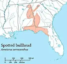 The spotted bullhead has confirmed records spanning Florida's northwest, northern, central and eastern Alabama, and northern and western Georgia.[1]