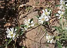 Amelanchier utahensis is a spreading plant, reaching a maximum of five meters (16 feet) in height. It is deciduous, bearing rounded or spade-shaped often toothed green leaves and losing them at the end of the season. In April and May the shrub blooms in short inflorescences of white flowers, each with five widely spaced narrow petals. The fruits are pomes. The Utah serviceberry is browsed by desert bighorns, elk, and mule deer, as well as many birds and domesticated livestock.